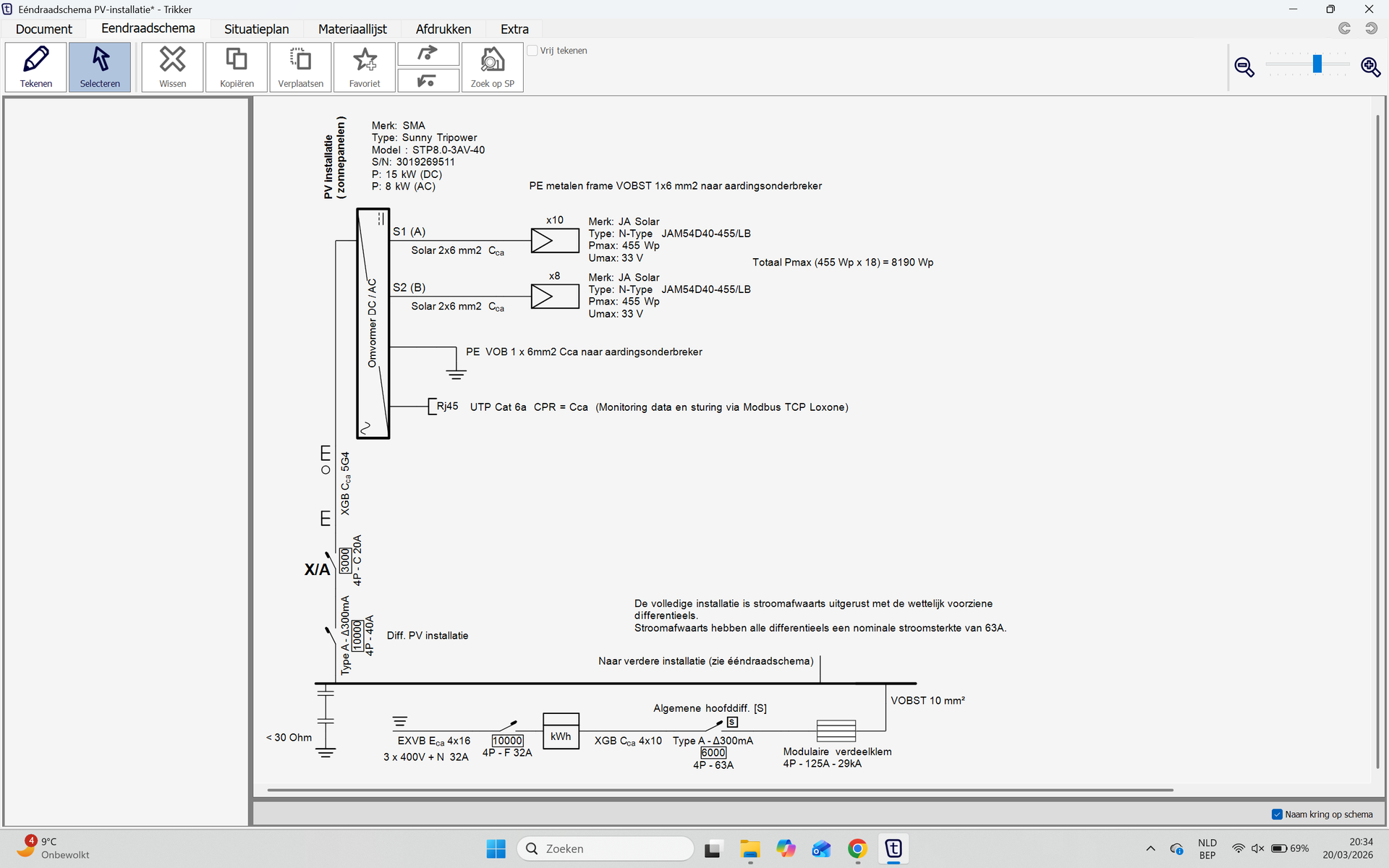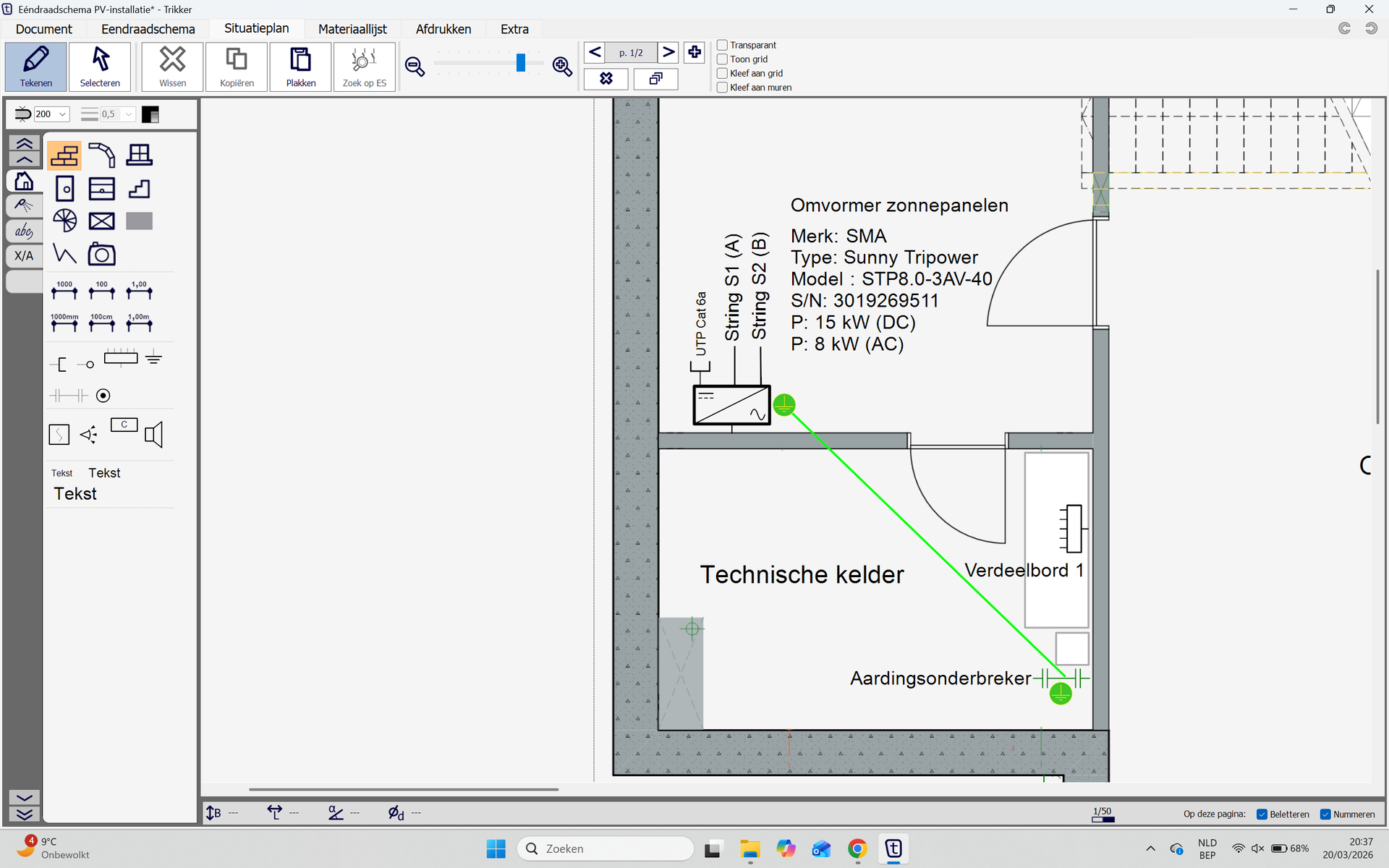 Hieronder publiceer ik graag een voorbeeld van een ééndraadschema en situatieschema van een PV-installatie. (zonnepanelen)